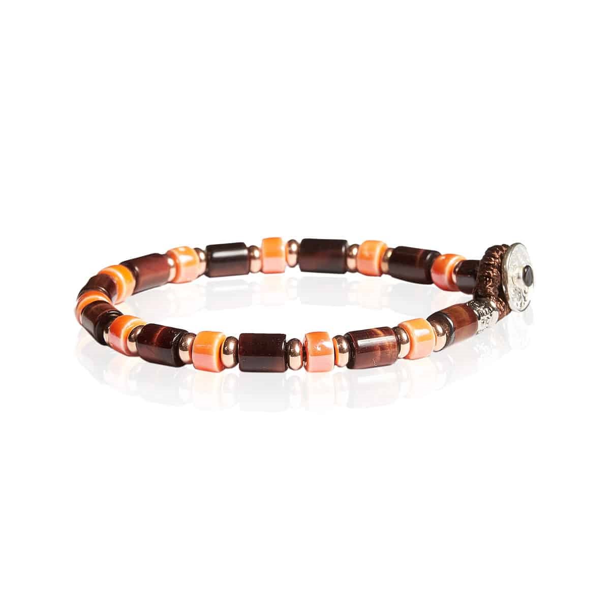 Il bracciale Gerba Fashionable 08 si distingue per il suo particolare design, realizzato con cordino in filo cerato, barilotti in Occhio di Tigre rosso, rondelle in ceramica e componenti in Argento 925.