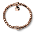 Bracciale in catena veneziana placcata oro rosa con centrale traforato openwork e zirconi. Chiusura a moschettone, misura 19,00 cm. Collezione classica.