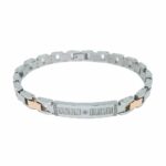 Bracciale firmato Zancan in acciaio inox. Targhetta in acciaio  Innovativa e di tendenza: uno stile per l uomo sicuro di esprimere la propria personalità.Tutta realizzata in acciaio 316 L Medicale, con trattamenti in oro rosa per creare colorazioni uniche, utilizzando particolari in fibra di carbonio impreziosita da pietre naturali come Zaffiri bianchi. larghezza  maglia mm 7 . lunghezza braciale cm 19