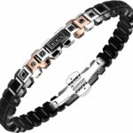 Bracciale in acciaio nero con inserti lucidi e laminati oro rosa, impreziosito da spinelli neri.