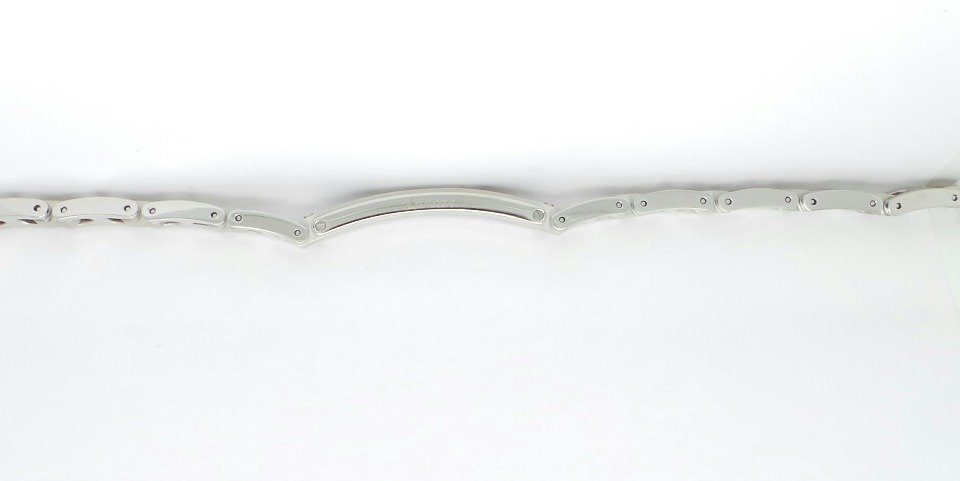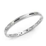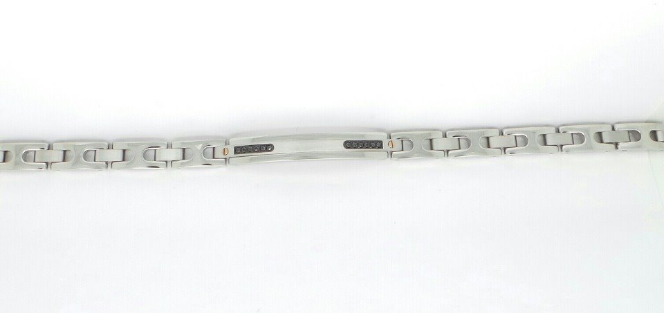 BRACCIALE UOMO LUCIDO IN ACCIAIO CON SEGMENTI , PIASTRA CENTRALE CON INCASTONATI DEI ZIRCONI NERI ,LUNGHEZZA CM 22 LARGHEZZA ELEMENTO MM6.1 .SPESSORE MM3.1,  CHIUSURA A GIOIELLERIA .POSSIBILITA’ DI ESSERE ACCORCIATO .