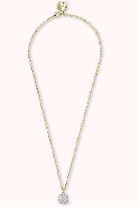 Collana Bronzallure realizzata in lega Golden Rosé, placcata oro giallo 18kt, con catena rolo impreziosita da un pendente quadrato (12×12 mm) con pavé in cubic zirconia luminose; chiusura a moschettone e lunghezza 47 cm con anellino interposto a 42 cm.