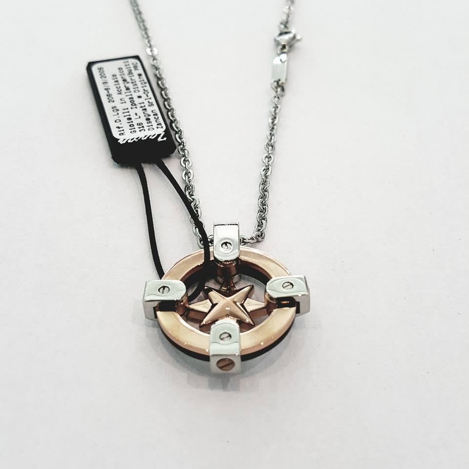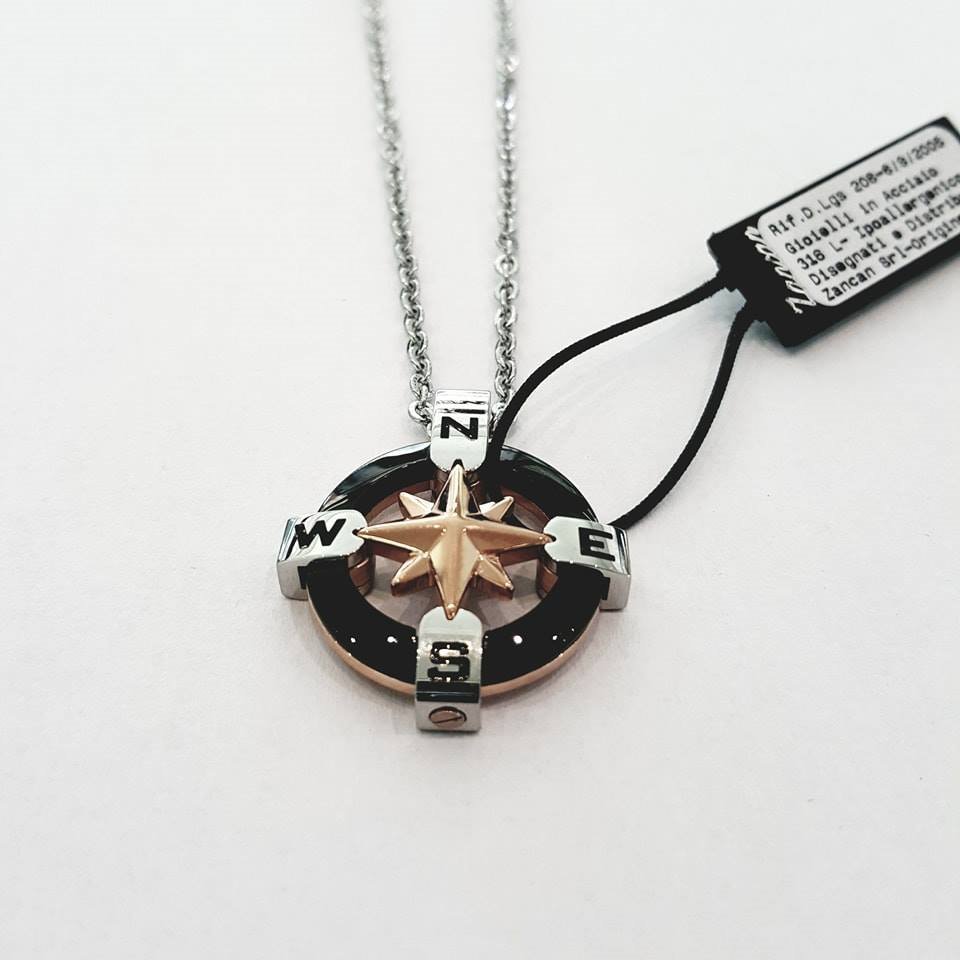 Collana in acciaio 316L ipoallergenico con Rosa dei Venti bicolore, mm.30×25.