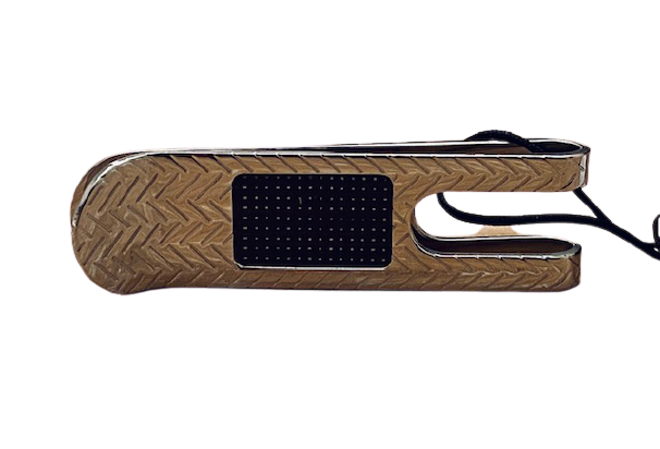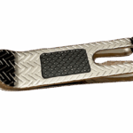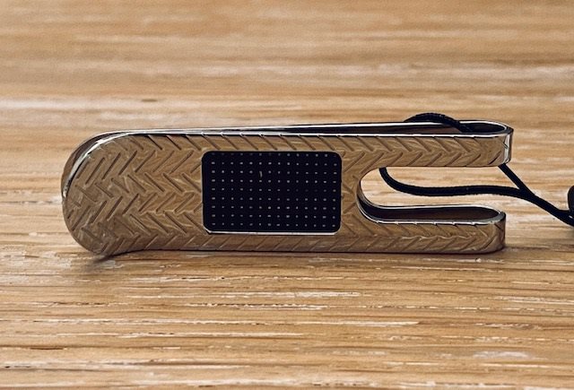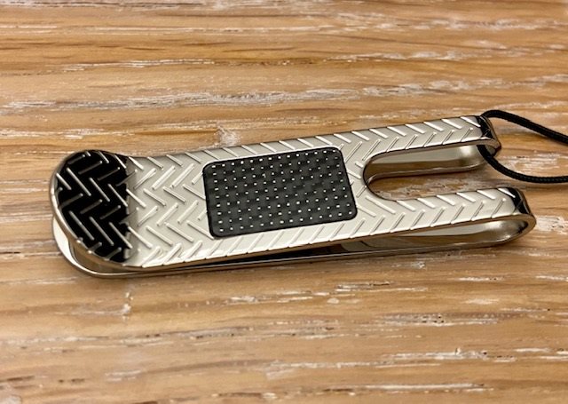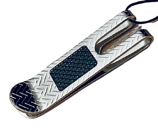 Fermasoldi marca “Zancan” in acciaio inciso con placca centrale in fibra di carbonio.