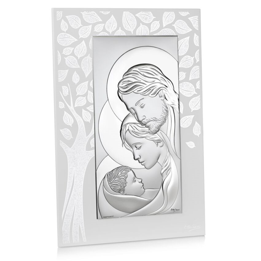 Icona della marca Ottaviani, lastra in Mirò Silver su base di legno bianco, può essere utilizzata sia con base da appoggio che come quadro da appendere. Raffigurata sopra la lastra troviamo la Sacra Famiglia con l’albero della vita sullo sfondo dipinto su legno bianco. Dimensione 30,8×46,3.