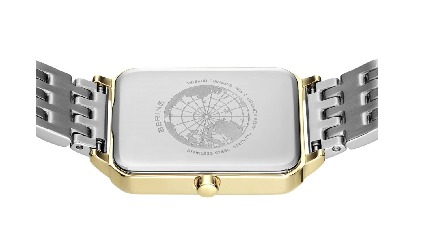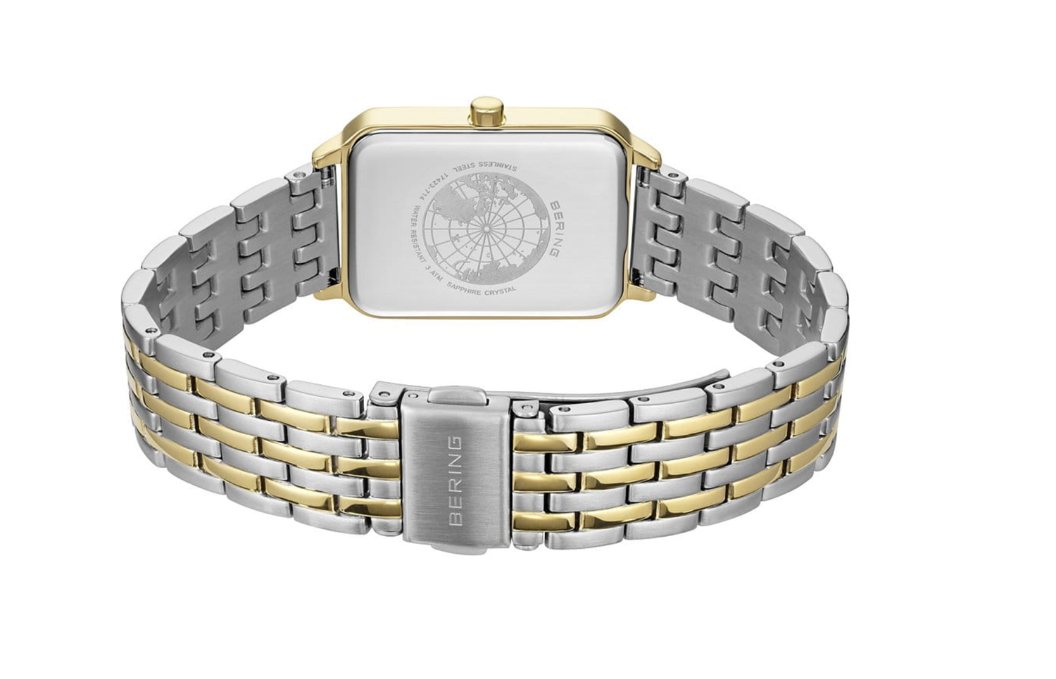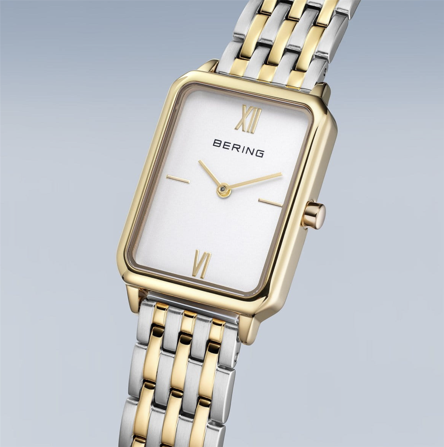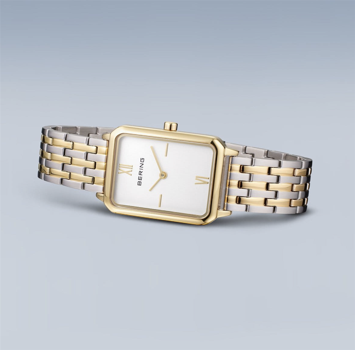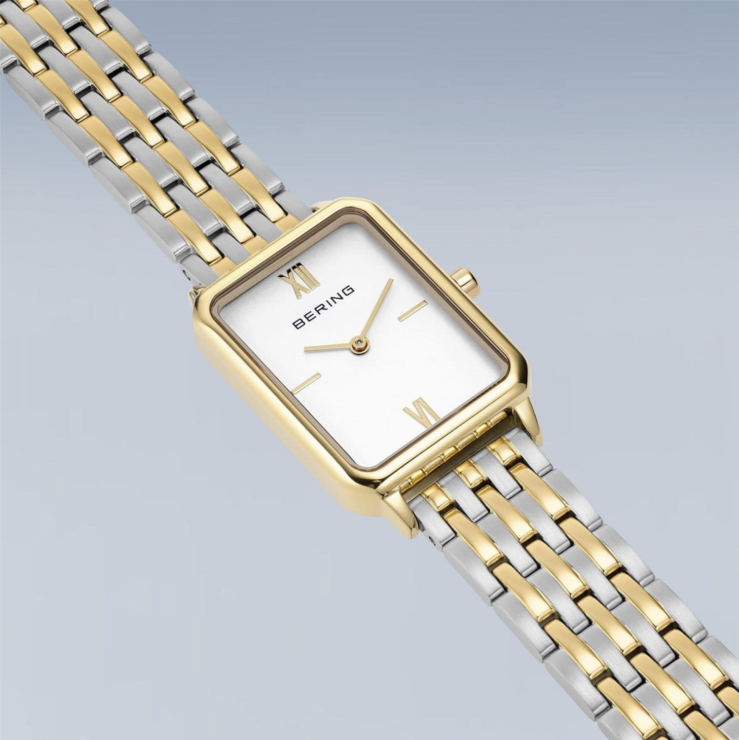 Questo orologio da donna della collezione BERING Classic affascina con la sua raffinata combinazione di oro e argento. La cassa rettangolare in acciaio inox dorato lucido (23 x 31 mm) racchiude un quadrante argento con sottili lancette dorate e discreti numeri romani alle ore 12 e 6.