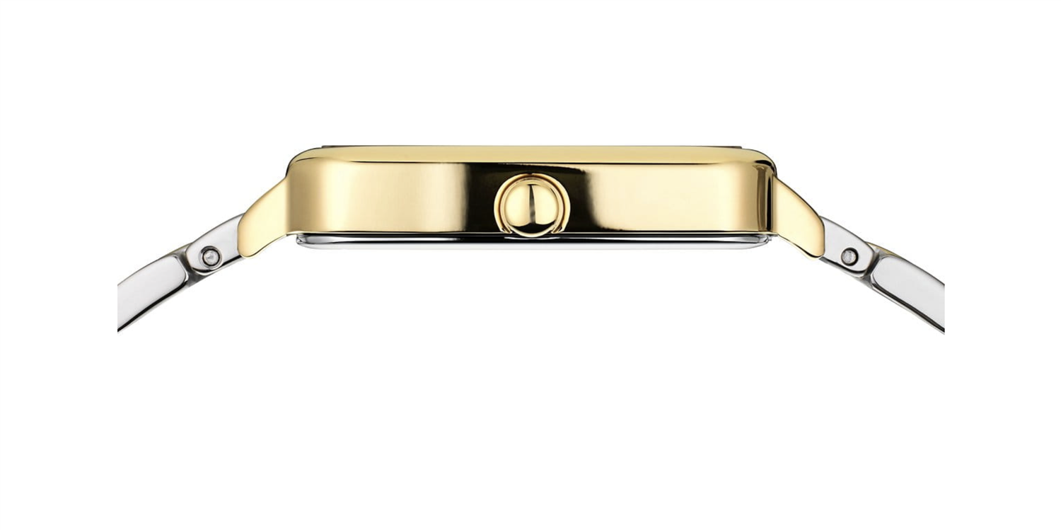 Il vetro zaffiro piatto protegge il quadrante minimalista e ne mantiene la brillantezza. Il bracciale bicolore in acciaio inox con chiusura deployante unisce maglie dorate e argentate in un design armonioso, moderno e senza tempo.