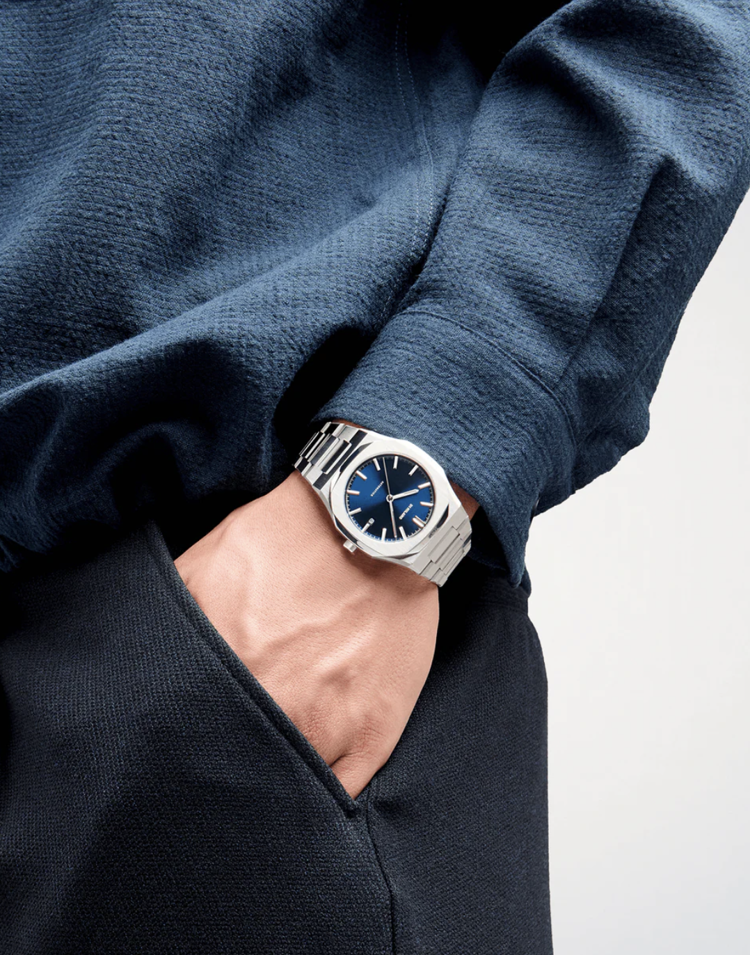 Nuovo Automatico, ora a colori. Raffinato con un quadrante sunray blu, abbinato a una cassa più sottile e un design del fondello trasparente.