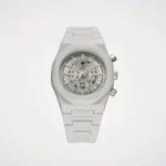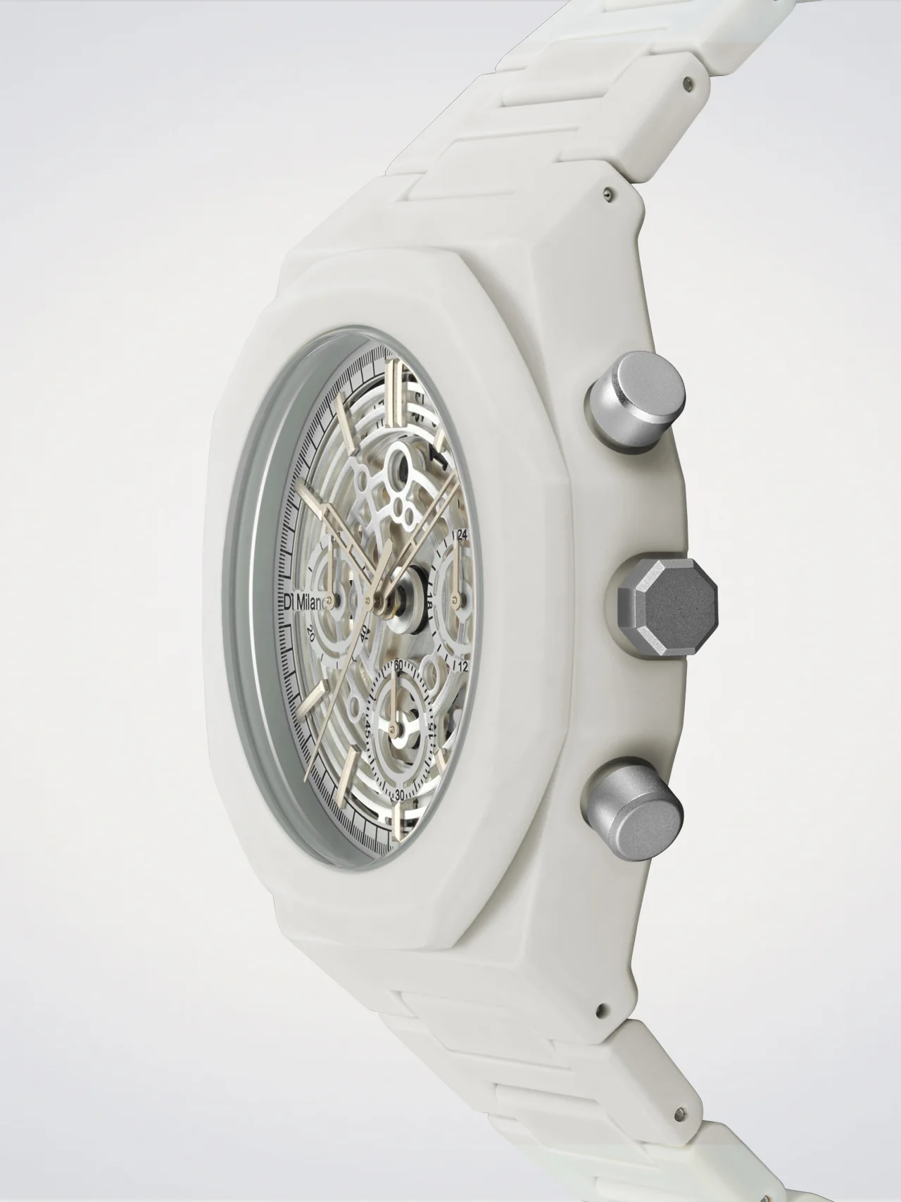 La palette grigia monocromatica è arricchita da un quadrante scheletrato tono su tono che lascia intravedere il movimento, donando profondità e carattere tecnico. I dettagli monocromatici sulle lancette dei sotto-quadranti cronografici aggiungono un tocco grafico deciso, per un look che non passa inosservato.